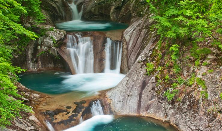 Nishizawa Gorge is a work of art forged by nature: it slowly formed over centuries, due to erosion caused by a granite flow. Mountain streams running though the primeval forest create waterfalls that bring forth a mystical charm. The Nanatsugama Godan no Taki (“Seven-pool, five-step waterfall”), seen toward the end of the route, is designated one of Japan’s “100 best waterfalls” by the Ministry of the Environment. Also notable is Ryujin no Taki, or “Waterfall of the dragon god.”