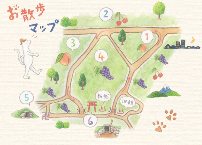 You will receive a map of the inn, featuring their kitty mascot character named “Mimi” who explains the walking course around the area. Depending on the season, you can see grape, peach, and even cherry fields. There is also a Buddhist temple and a Shinto shrine along the path—and if you're lucky, you can stop some stray kitties walking along the path as well!