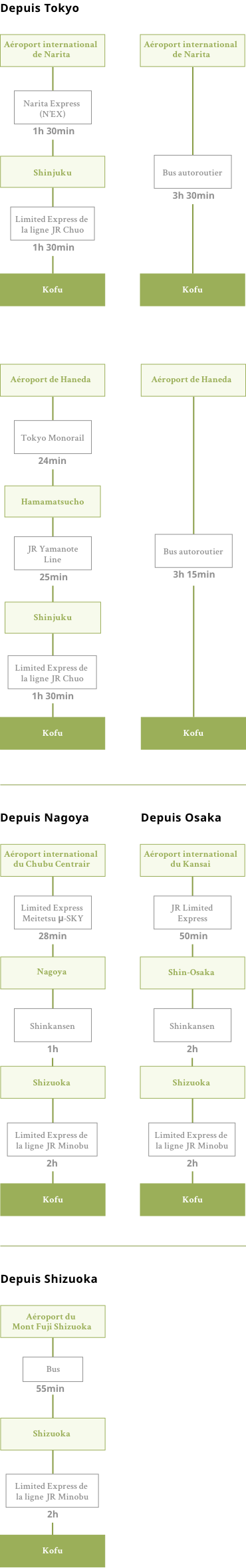 La situation de Yamanashi, juste à côté de Tokyo, la rend facilement accessible depuis la capitale et ses principaux aéroports. Des trains et des bus routiers fréquents relient Yamanashi au centre de Tokyo ainsi qu'aux aéroports de Narita et Haneda.