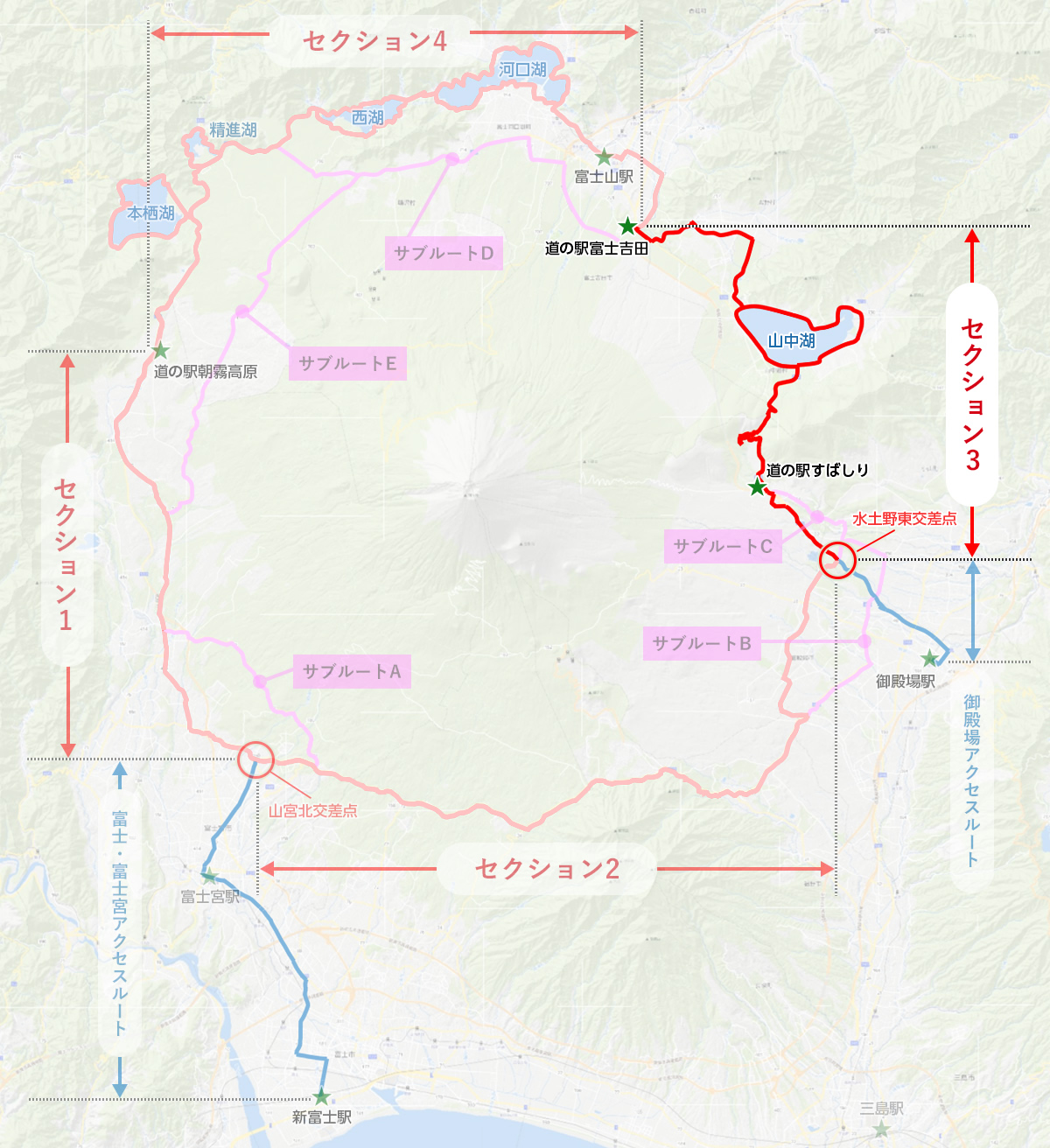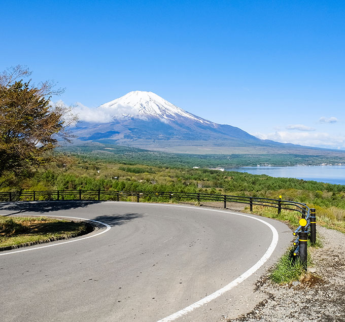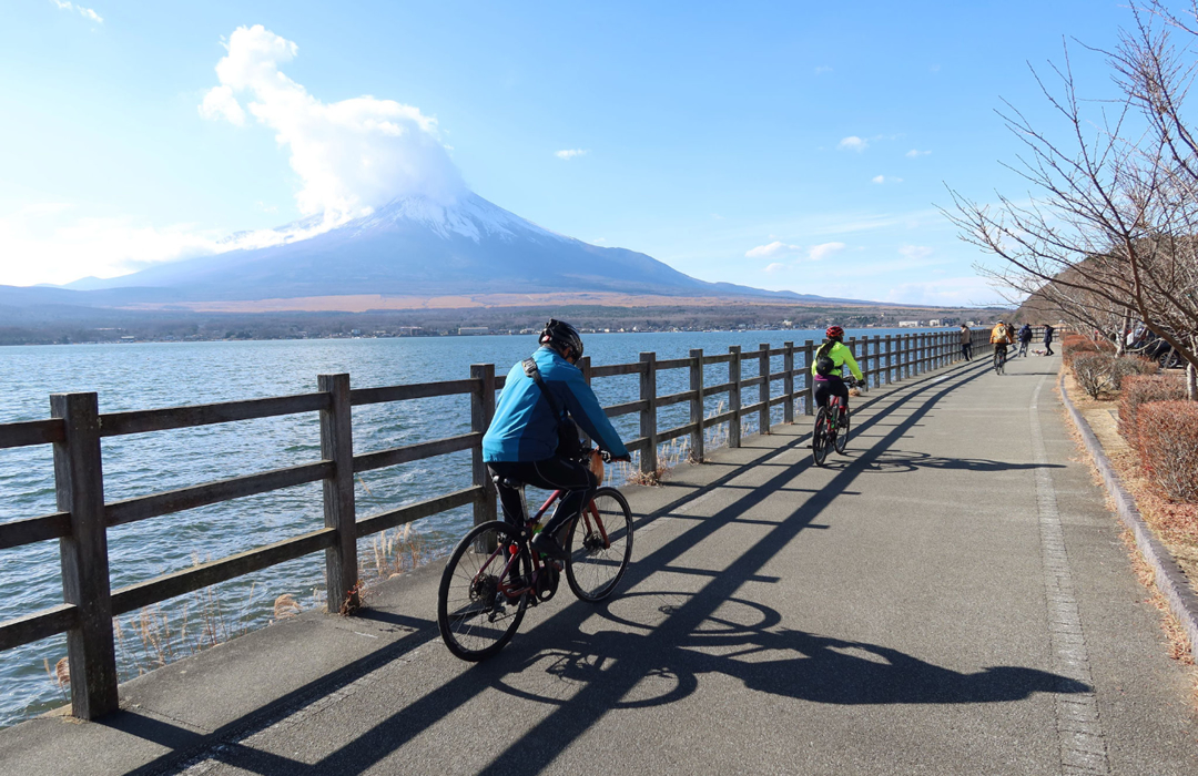 東京2020オリンピックの自転車競技ロードレースで使用された山岳ルートを抜け、富士五湖の中でもっとも富士山に近い山中湖を周遊するコース。レースの勝負どころとなった「籠坂峠」などのヒルクライムスポットは上級者向きです。一方で、山中湖周辺は一部サイクリングロードも整備されており、傾斜も緩やか。富士山の絶景ポイントを巡りながらの湖畔サイクリングや忍野八海をはじめとした観光スポット巡りを満喫できます。