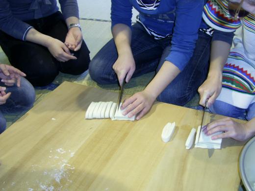 加工体験施設ではほうとうの手打ち体験も受け付けております。(要予約・10~30名位)