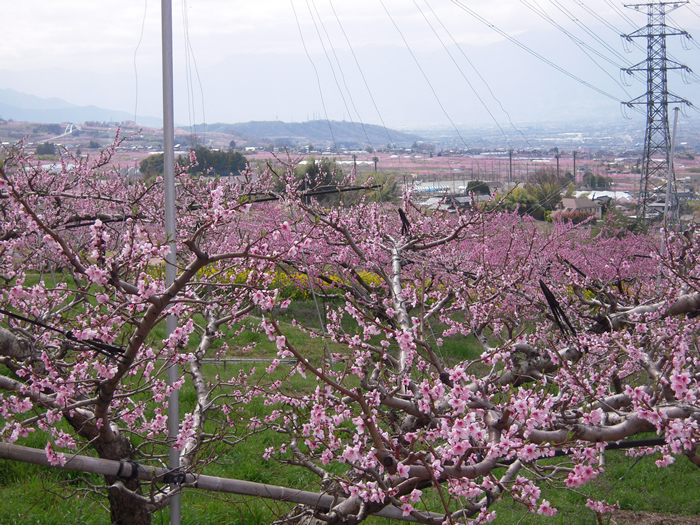 残雪の南アルプスをバックにピンク色の絨毯を敷き詰めたような桃の花はまさに桃源郷にふさわしい眺望です。