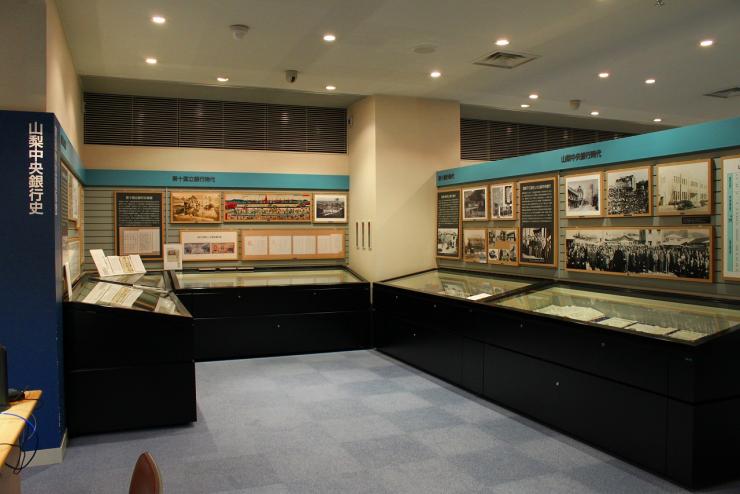 館内はテーマ別に展示コーナーが設けられ、山梨中央銀行の歩みを中心とする歴史的文献や、古代から今に至るまでの貨幣j実物がされています。