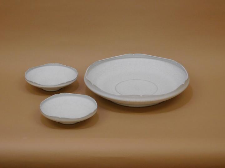 マット白釉の組鉢:日常使いの6寸と9寸。周囲を輪花カット装飾がラウンドしています。