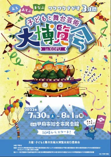 子どもと舞台芸術大博覧会実行委員会と連携し、子どもたちが気軽に文化・芸術に触れ、情操を豊かに育み、創造性を高められるよう、「子どもと舞台芸術大博覧会2022 in KOFU」が開催されます。