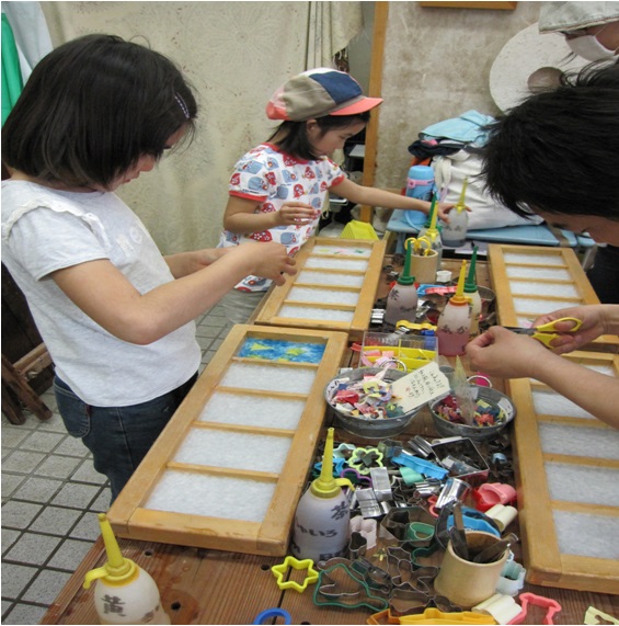 紙を漉き、染料や色紙を使ってオリジナルデザインのハガキが5枚作れます。和紙の原料となる楮(こうぞ)の繊維をたたくところから体験できるコースもあります。
