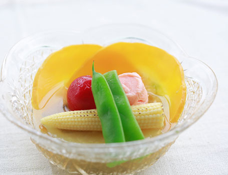 サラダ感覚で生でも食べられる、ちょっと珍しいカボチャ、コリンキー。クセがなく、さっぱりと食べやすい味なので、様々な料理に応用できる野菜です。シャキシャキの歯ごたえがピクルスにおすすめだと坂本さん。レモンイエローの食欲をそそる色合いも魅力で、料理人の創造力をかき立てる野菜でもあるようです。「まだいろんな料理法を開発できそうな、可能性のある野菜だと思います」と中山さん。