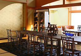 坐忘館内にある、静かな時間を過ごせる空間です。ワインやソフトドリンクが無料で提供され、様々なジャンルの書物と共にお愉しみいただけます。