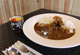 まるき葡萄酒の熟成赤ワインで長時間煮込んだカレーです。スパイシーなカレーソースと柔らかい牛頬肉のとろける旨味が癖になる逸品です。