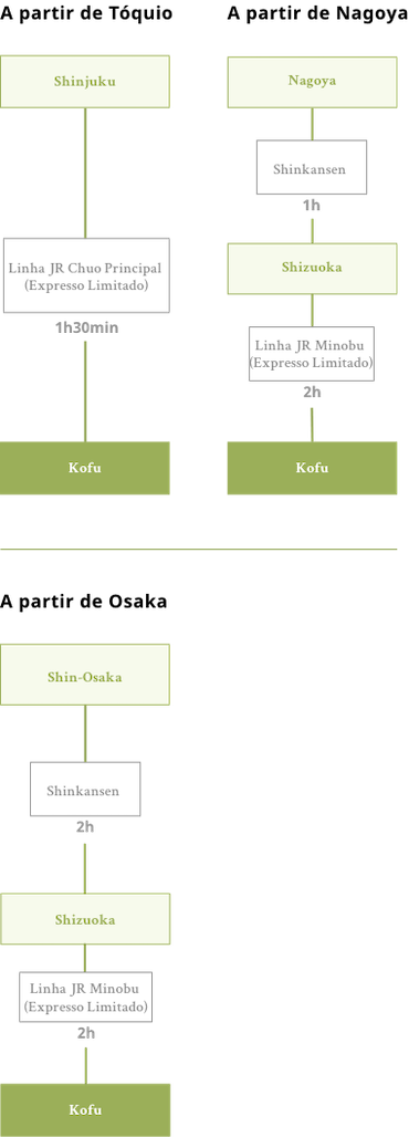 A localização de Yamanashi, situada ao lado de Tóquio, torna a província convenientemente acessível a partir da capital e de seus principais aeroportos. Há trens e ônibus rodoviários frequentes entre Yamanashi e o centro de Tóquio, bem como dos aeroportos de Narita e Haneda.