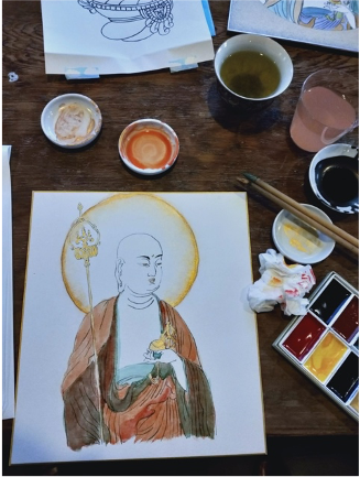 O local oferece uma oficina de pintura budista! A Sra. Chiyuki fornece o material e nos mostra, na prática, os princípios básicos da técnica como a criação das cores desejadas, preparação e escolha dos pincéis e a maneira de segurá-los, peculiar ao estilo budista.