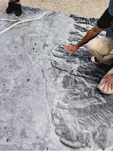 O guia do museu nos explica sobre o processo de sedimentação da Obsidiana com o auxílio desta representação em tamanho real rica em detalhes.