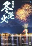 河口湖の冬の風物詩。湖上を彩る花火大会! 澄み切った空気の中、冬化粧した富士山を背景に鮮やかな…
