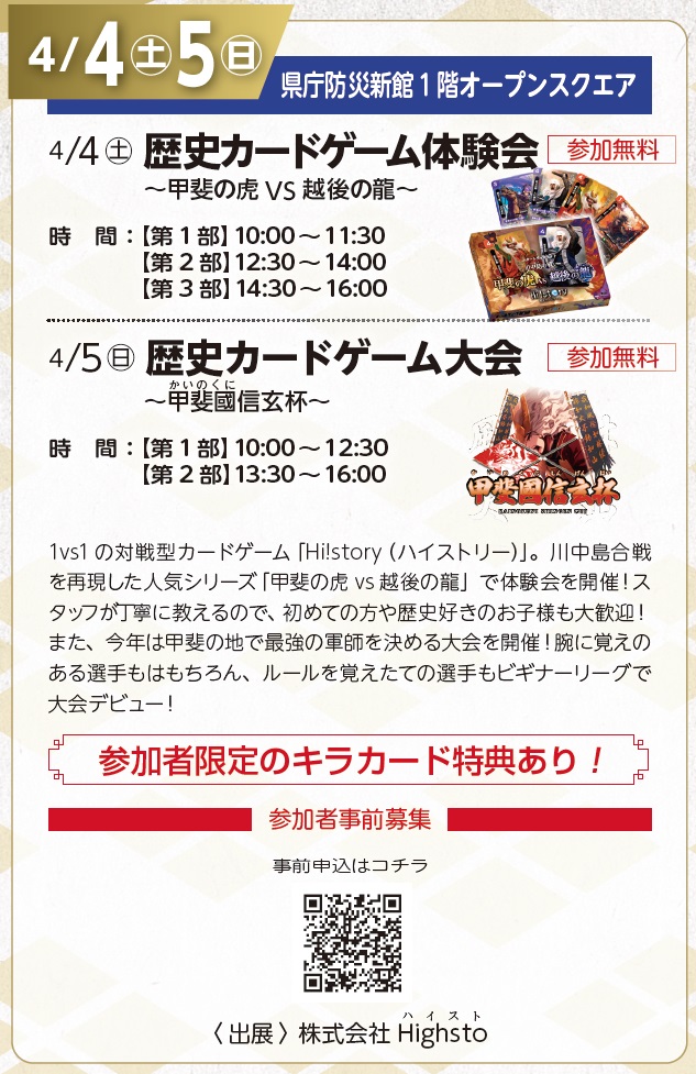 1vs1の対戦型カードゲーム「Hi!story(ハイストリー)」。甲斐の地で最強の軍師を決める大会を開催!腕に覚えのある選手はもちろん、ルールを覚えたての選手もビギナーリーグで大会デビュー!