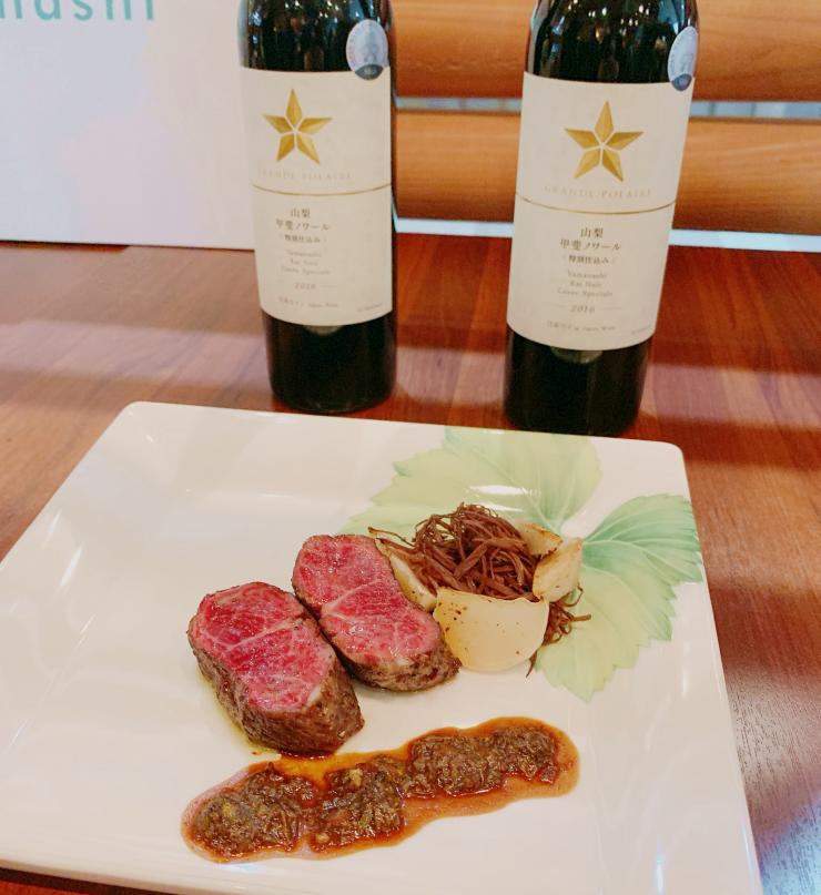 肉にふき味噌ソースを少しつけ、このワインに合わせると、ふき味噌の苦みと甲斐ノワールが調和し、