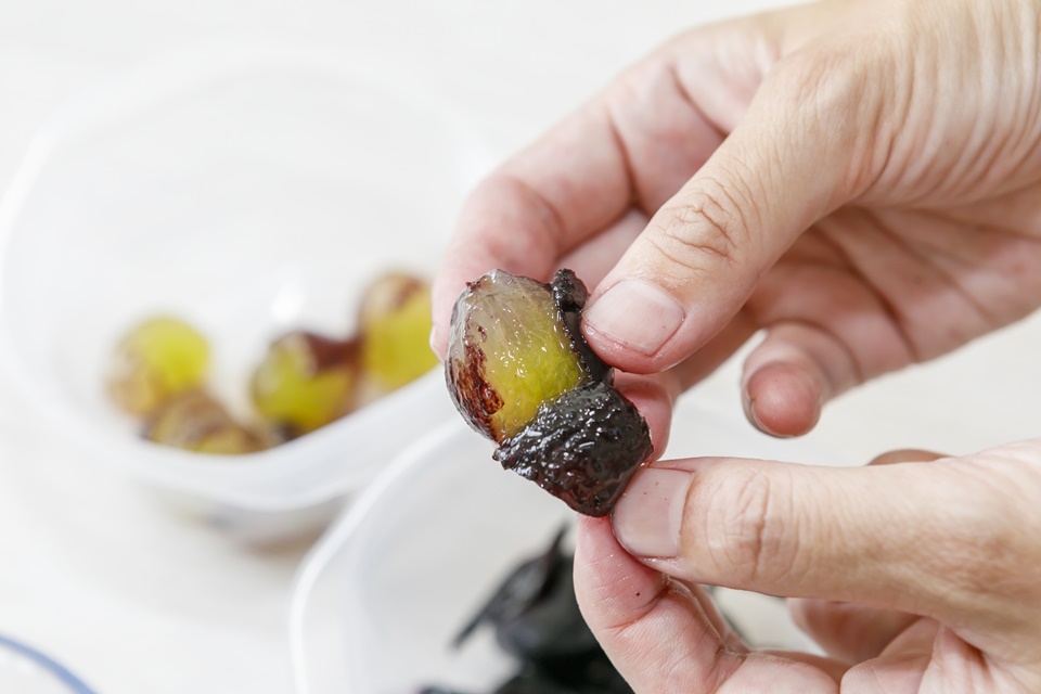 まず主役となるぶどうの皮を剥いていきます。剥いたぶどうの皮はマリネソース作りに使うので捨てずに取っておきましょう。