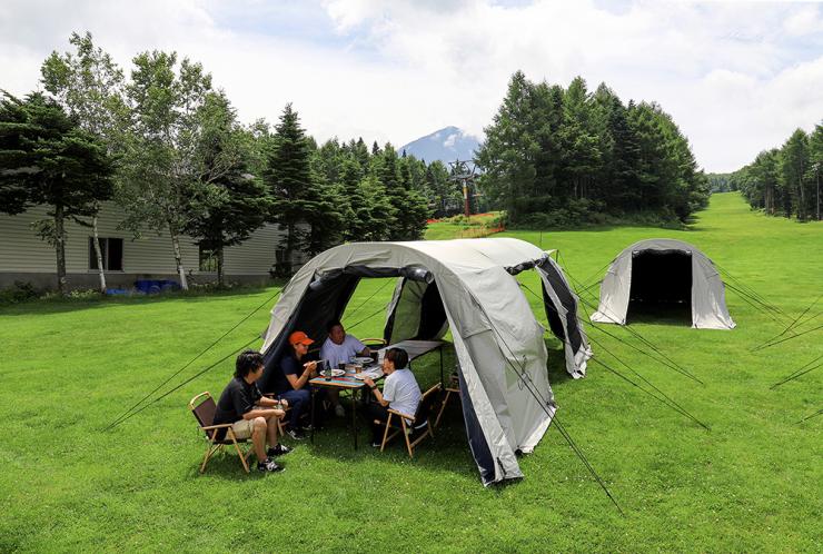 2020年、夏のゲレンデにデイキャンプスタイルのふじてんBBQがオープンしました。最大8人が入れるかまぼこ型のテントに2バーナーのガスグリル、食器などが完備されており、手ぶらでバーベキューが楽しめてしまう新しいアウトドアスポットです。食事のコースはライトコースからプレミアムコースまであり、富士桜ポークのロースステーキ、信玄鶏など地域の食材をふんだんに使ったバーベキューが楽しめます。サイト数が限られるので、土日休日等は事前予約が必要です。