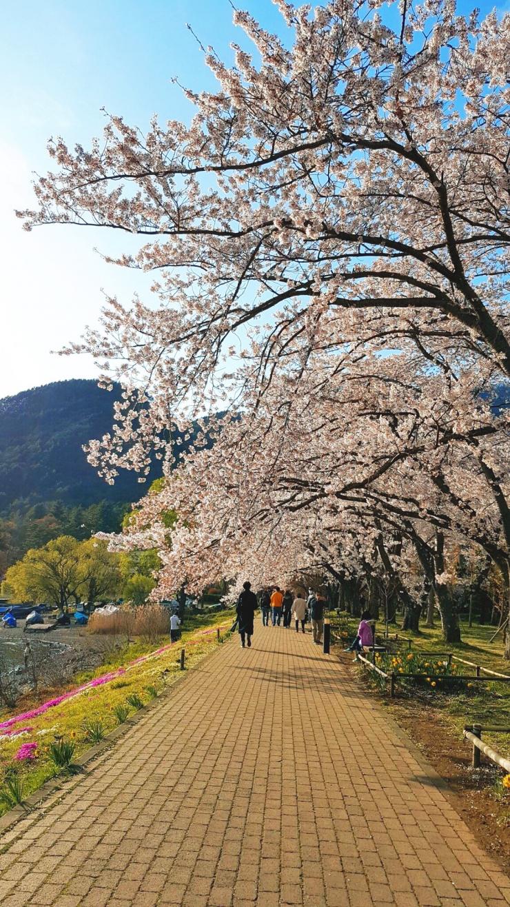 Đây là một địa điểm tuyệt vời vì bạn có thể ngắm hoa anh đào, núi Phú Sĩ, hồ Kawaguchi cùng một lúc!