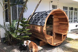 熱したサウナストーンに水をかけて、ロウリュを楽しむものです。サウナストーブはフィンランド「ハルビア」製のもの。サウナは自由に設計できます。バレルサウナは、樽状の木製サウナで、屋外に設置するタイプです。